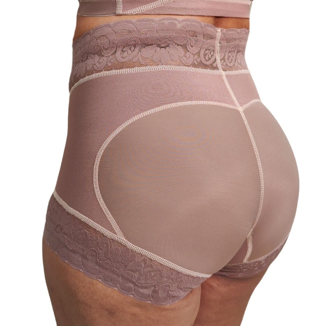 Faja panty de alta compresión con efecto levanta glúteos y control de vientre bajo. Ideal para uso diario. Fabricada en Powernet y Spandex con blonda siliconada. Cuenta con gafetes frontales para ajuste.
